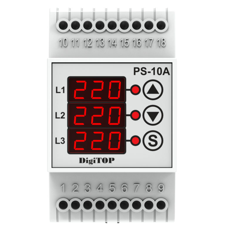 Перемикач фаз PS-10A призначений для живлення промислового і побутового однофазного навантаження 220/230В 50Гц від однієї з фаз трифазної мережі, з метою забезпечення живлення особливо відповідального однофазного обладнання від найбільш якісної фази і захисту його від підвищеної або зниженої напруги.
