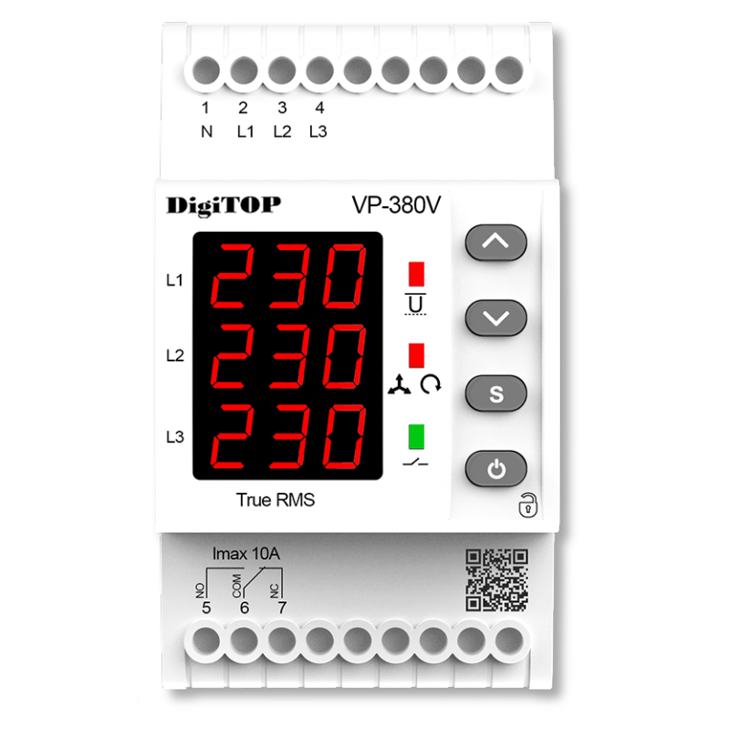 Трифазне реле напруги VP-380A призначене для захисту трифазного електрообладнання від неприпустимих перепадів напруги, асиметрії фаз, зникнення фаз, контролю порядка чергування фаз. Пристрій запобігає виходу з ладу і продовжує термін експлуатації електрообладнання.