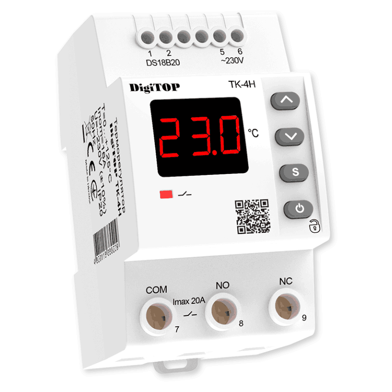 Терморегулятор (Регулятор температури) ТК-4Н призначений для контролю і підтримки температури (діапазону температур) в житлових і виробничих приміщеннях шляхом включення і відключення нагрівального обладнання. Терморегулятор відстежує температуру по одному каналу (датчику) з відображенням її поточного значення на цифровому світлодіодному індикаторі.