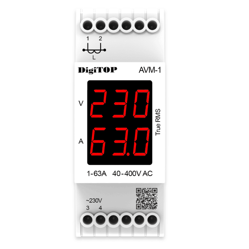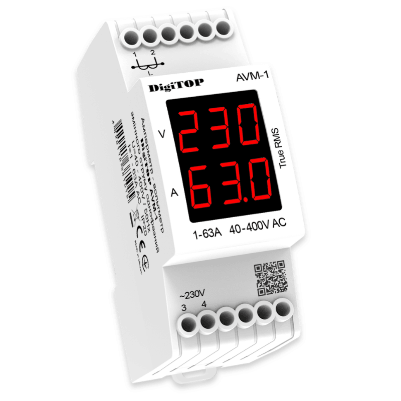 Цифровий Амперметр-вольтметр АVМ-1 призначений для вимірювання діючого значення струму і напруги в однофазній мережі з відображенням поточних значень на цифрових світлодіодних індикаторах. Вимірювання сили струму проводиться за допомогою зовнішнього трансформатора струму (поставляється в комплекті).